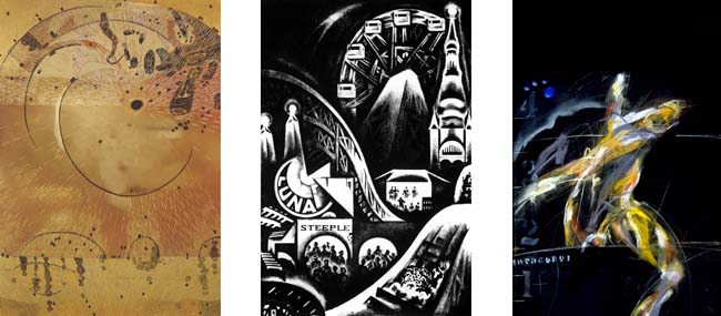 "The Measurement" by Lee Mullican (1952), "Coney Island (Luna Park)" by Louis Lozowick (1925), "Atomic Physiques" by Wynn Wolfe (1990).