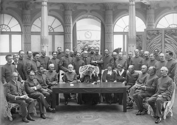 Seated (L to R): Fred Dick, Herbert Coryn, H. T. Edge, E. A. Neresheimer, Clark Thurston, Katherine Tingley, Elizabeth Spalding, Elizabeth Whitney, Reginal Machell, H. T. Patterson, J. H. Fussell, George F. Mohn.