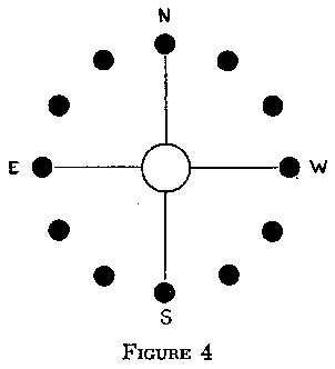 The earth-plane is represented by the red line. For illustration of another way in which the solar universe was imaged, identical in principle with the foregoing, we have this twelvefold scheme as viewed by the North American Plains Indian teachers (Figure 4). [For more detailed treatment of this "Medicine Wheel," which for the Plains Indians symbolized the solar universe among other things, see The Sacred Pipe, Joseph Epes Brown (1953) and Seven Arrows, Hyemeyohsts Storm (1972).]